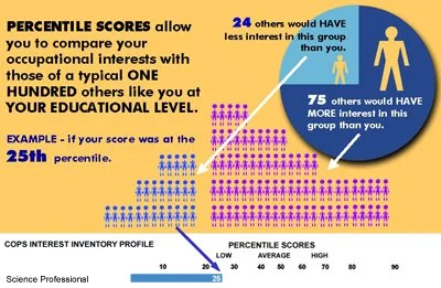 For an interest score of 50, nearly half (or 50%) had a lower interest level on that particular cluster. The higher the score, the greater the interest is as compared to others at the same educational level. Typically, a score of 70% or higher indicates a very high degree of interest in a cluster. Whereas, a score of 25% or lower indicates a significantly lower level of interest.